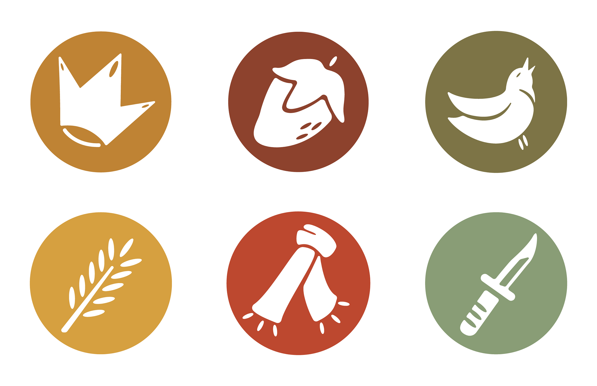 This system of icons is based on fleet foxes' self-titled album. each represents an object mentioned in some of the songs: The golden crown, the strawberries, the meadowlark, the wheat, thered scarf, and the silver dagger.