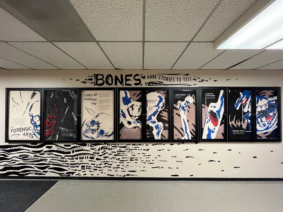 this mural was created for the filming of Michelle Vitali's showcased forensic work for unsolved mysteries, a netflix special. a group effort, my colleagues and i utilized ink, charcoal, and other fine arts media to create a map of interesting textures. my portion of this mural included 3 large poster elements, emphasized by a 3-dimensional approach with painted glass.