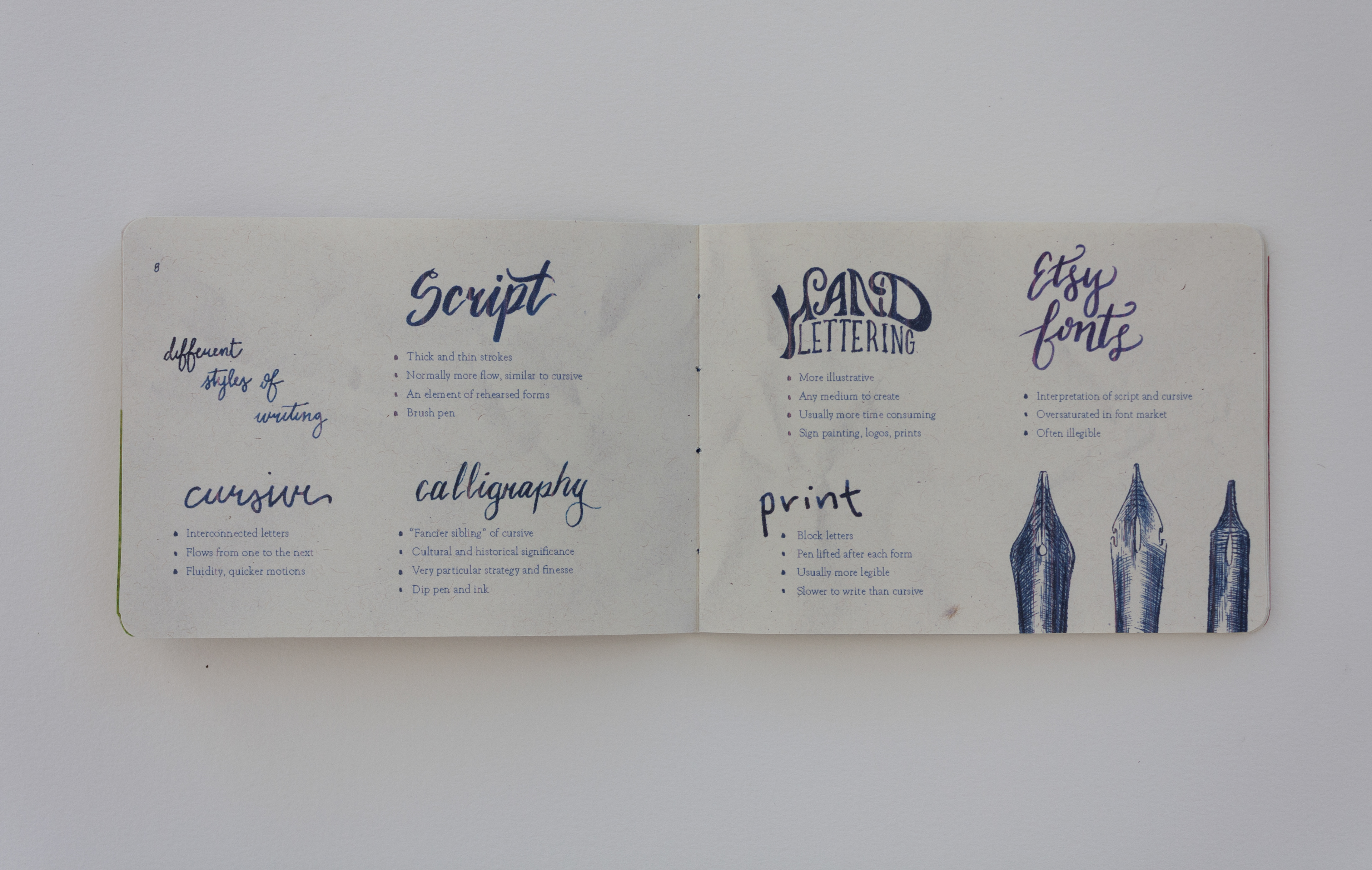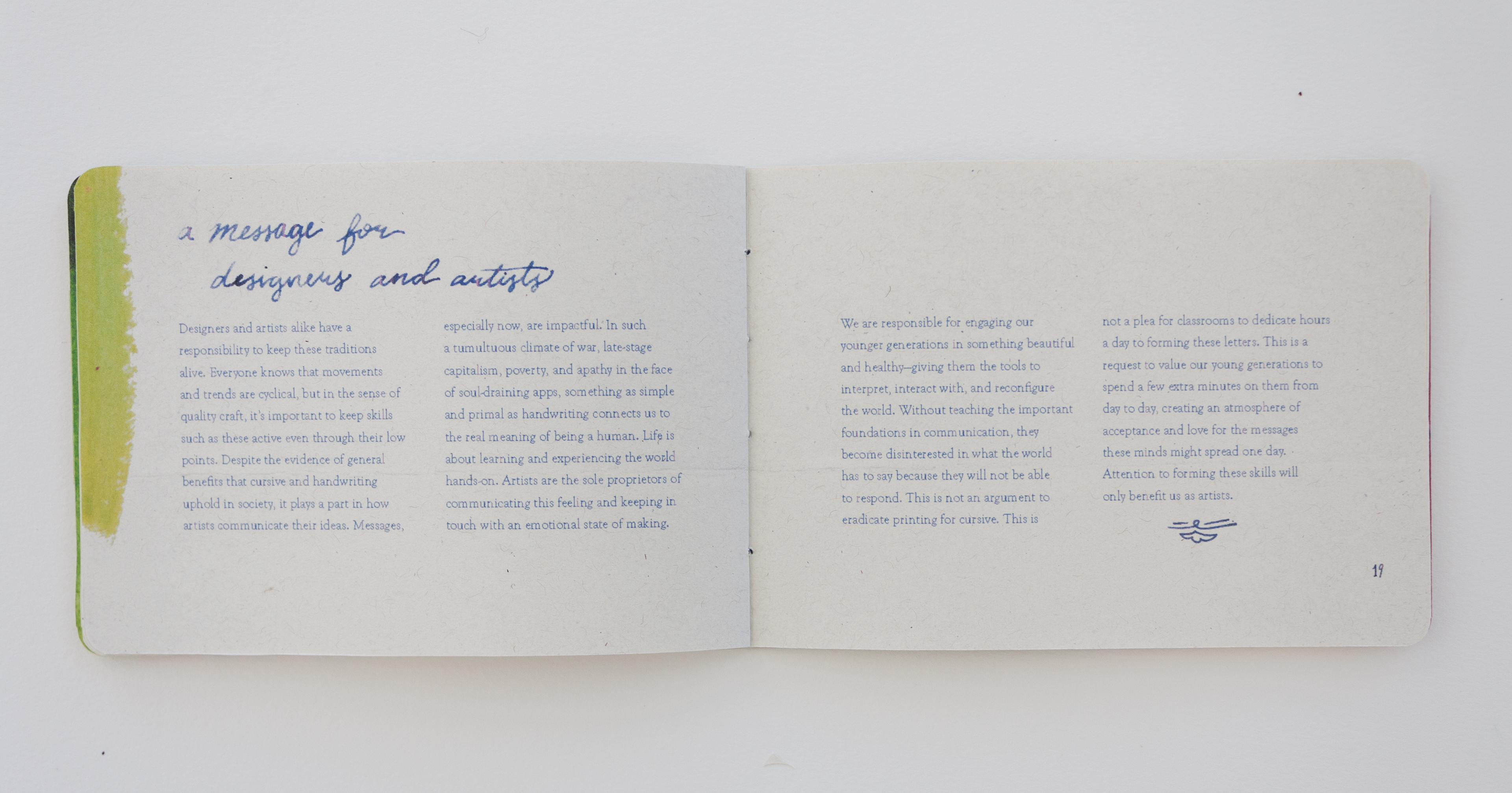 in our age of technology and immediate gratification, most of the united states education system has done away with teaching cursive handwriting. this loss is not only an issue in the eyes of artists, but also all craft and technique-based work in our society. though, from a purely design standpoint, this new gap in development for younger generations is certain to affect typography, design processes, and the technicality of design at a global level within the next few decades. it is no secret that handwriting in general is being given less attention and is, therefore, having effects on younger generations’ abilities to communicate; this is sure to translate into the work of new generations of artists, filtering into future trends and changing forever the way in which we view the world through type. in this zine, explore my predictions of future trends in typography based on the new loss of motor skill during these times of chronically online learning. i did research on the importance of teaching handwriting and its origins in design, using this evolution to discuss what comes next for our young artists.
